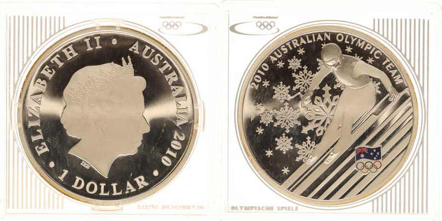 Austrálie, Alžběta II. (1952-), 1 Dollar 2010 - OH 2010, sjezdař Schön 1554 Ag 999 31,6