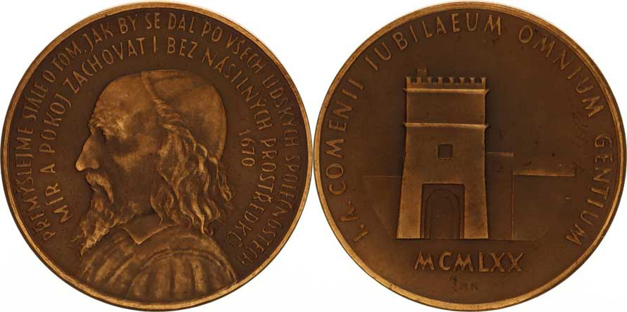 Jan Amos Komenský portrét zleva, dvojřádk. opis s datací 1670 / H radební brána, latinský opis a datace MCMLXX sign.: MK patin. bronz 45 mm orig. etue