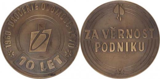 10 let Drogerie Olomouc1960-1970, Uprostřed znak podniku, opis / V trojkruhu 2-řádk. nápis "Za věrnost / podniku" bronz 50 mm PMP-E 17a