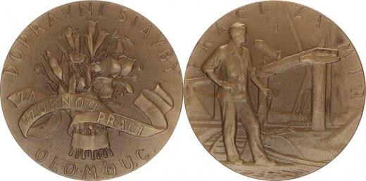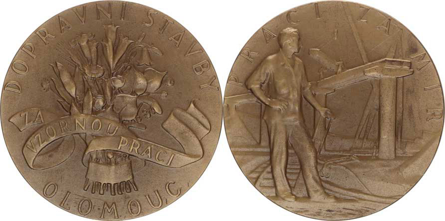 Dopravní stavby Olomouc, Kytice květů převázána stuhou s nápisem "Za vzornou práci" / Dělník zprava, na pozadí silueta mostu, nápi s "Práci za mír" sign. KRÁL bronz 60 mm PMP-E 16b e tue