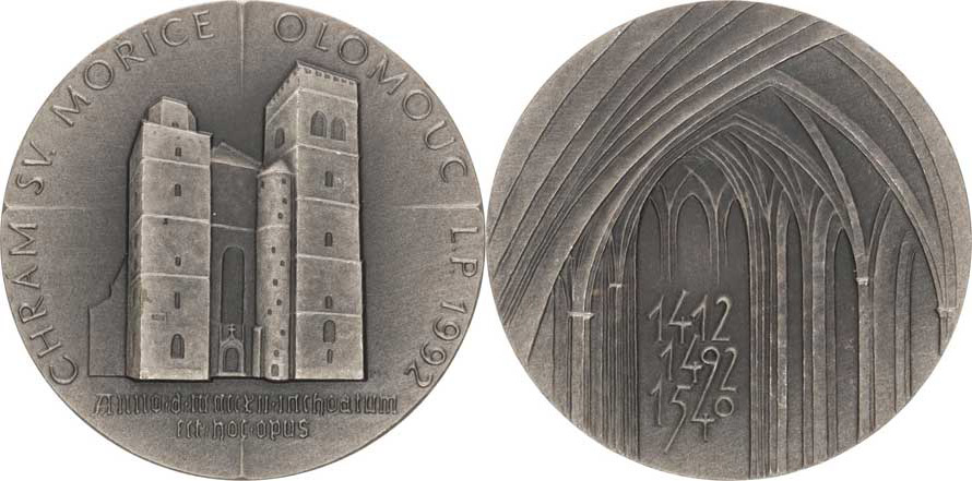 Chrám sv. Mořice Olomouc L.P. 1992, průčelí kostela / gotická kle nba a datace 1412/1492/1540 sign.: MK (Miroslav Kovařík) p ostř. bronz 50 mm PMP 25b
