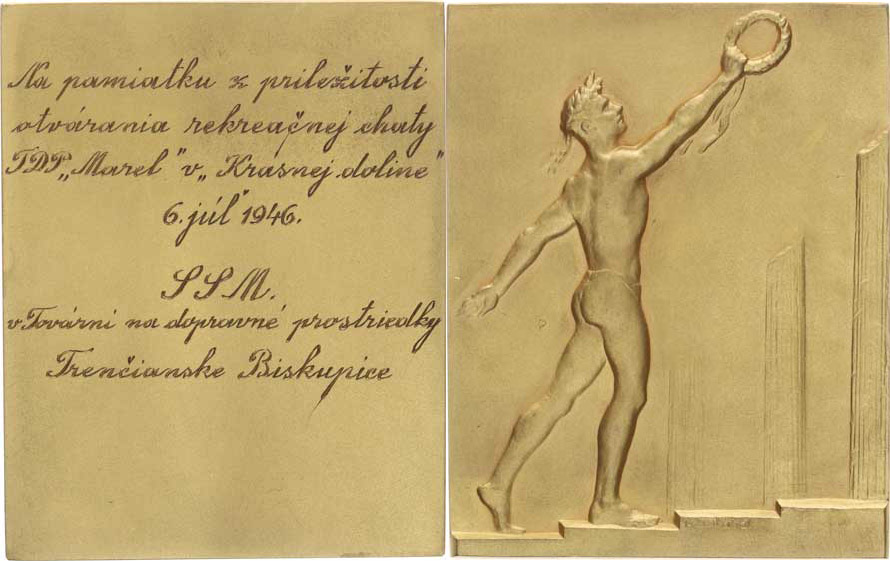 Na pamiatku z príležitosti otvárania rekreačnej chaty TDP "Marel" v Krásnej Dolině 6. júl 1946, SSM v továrni na dopravné prostried ky, 7-mi řádk. nápis / Atlet s věncem před antic. sloupy sign. : K.Otáhal zlac. bronz 49x64 mm