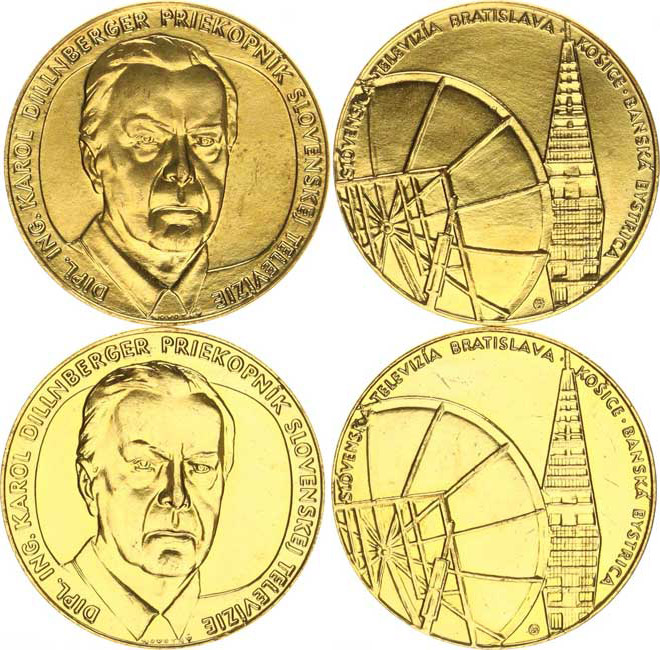 Dipl. Ing. Karol Dillnberger, priekopník Slovenskej televizíe , hlava čelně / symbolika, satelitní anténa a televizní věž, opis raž. MK zlacený kov 27 mm kapsle 2 ks