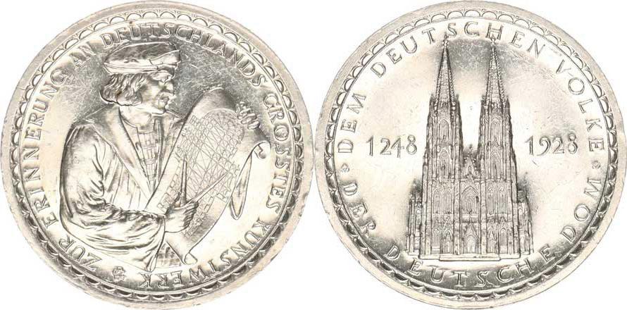 Kolín n.Rýnem - DER DEUTSCHE DOM 1248-1928, katedrála / Stavitel chrámu s plánem Ag 900 36 mm 24,955 g "R", dr. rys.