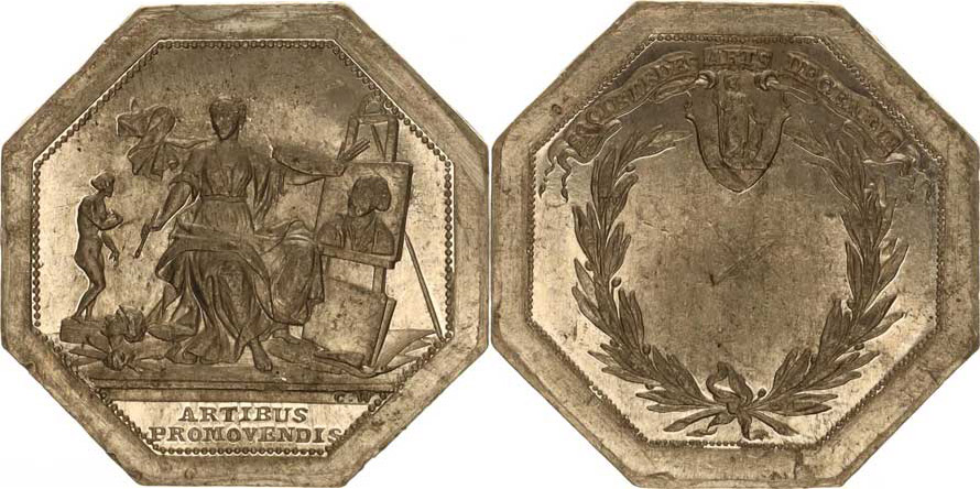 Genéve (Ženeva) - Podporovat umění, malíř u stojanu / nahoře v otevřeném věnci městský erb a stuha s nápisem Sn 8-mi úhelník 36 mm