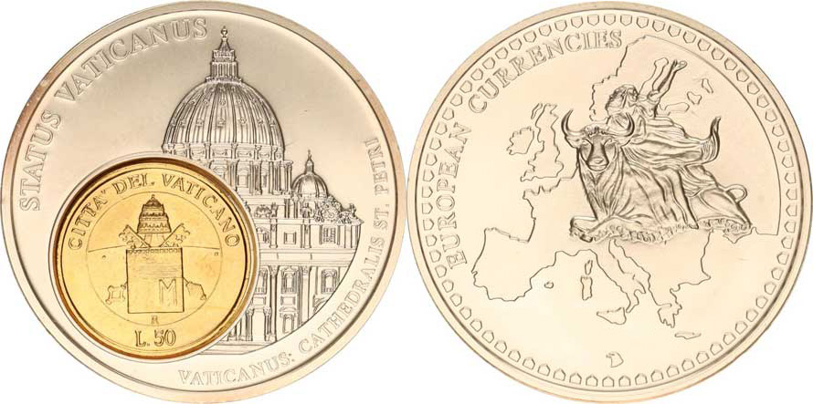 Evropská měna, na styliz. mapě jedoucí Evropa na býku / katedrála Sv. Petra ve Vatikánu +vložená zlacená 50 Lira bílý kov 40 mm kapsle