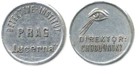 Praha - Detektive institut "Lucerna", text / hledící oko a nápis: Direktor: Chodounský Al 18 mm