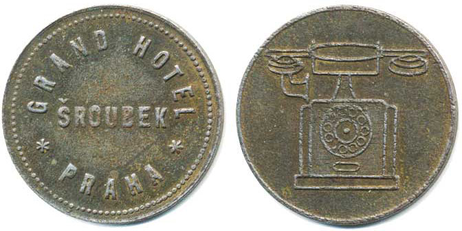 Československo - nouzovky, známky, Praha - Telefonní žeton, Grand Hotel Šroubek, text / telefon