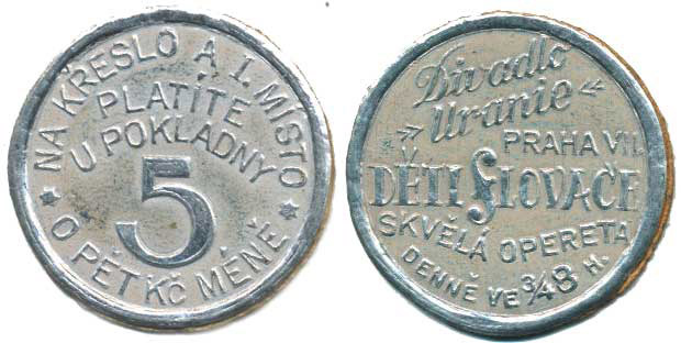 Praha - Divadlo "URANIE", opereta Děti Slovače / Žeton na slevu 5 Kč Al 25 mm
