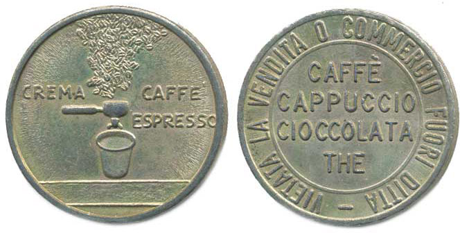 Itálie - nouzovky, "Crema Caffe Espresso", žeton do fy automatu na kávu a jiné nápoj