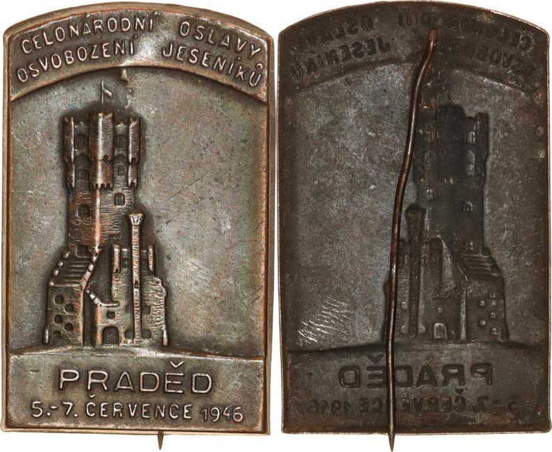 Praděd - Celonárodní oslavy osvobození Jeseníků 1946, stará roz hledna bronz. pledch 28x44 mm