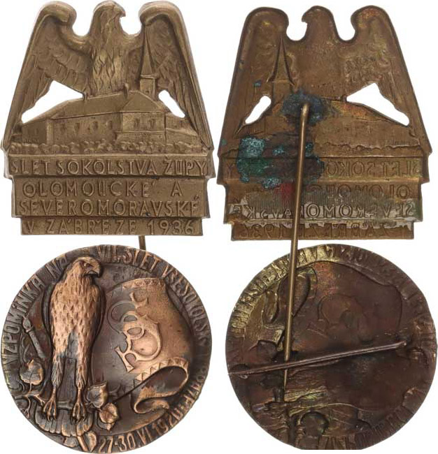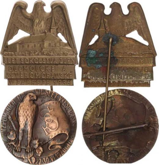 Vzpomínka na VII. slet všesokolský v Praze 27.-30.VI 1920 Cu plech 31 mm spona PŠ 38; NO: VII.16 2/ Slet Sokolstva župy Olomoucké a Severomoravské v Zábřeze 1936 mosaz. plech 13x34 mm jehlice 2 ks