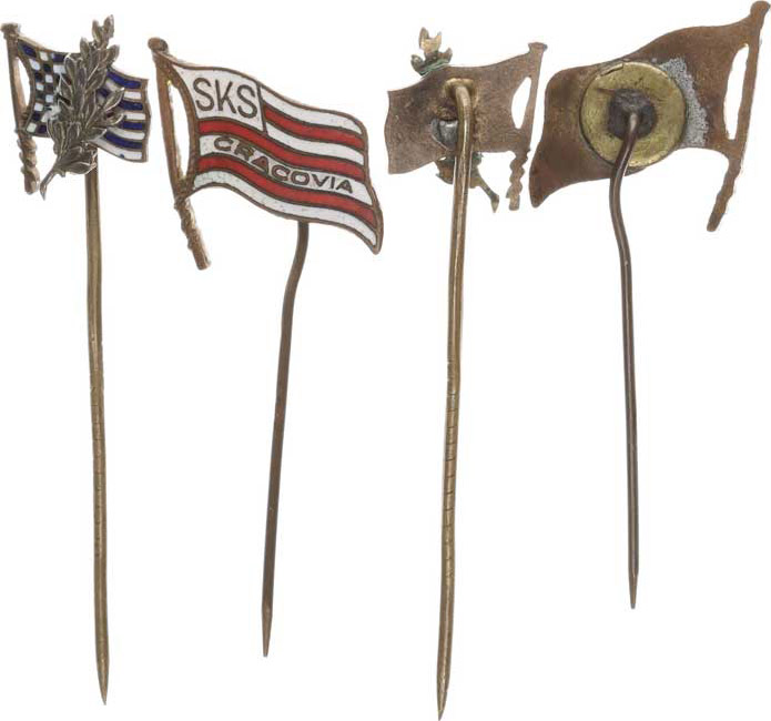 SKS Cracovia (Sportovní klub), Červeno-bílá vlajka na ráhnu smalt. bronz 18x9 mm jehlice 2/ Anonymní - Dubová větvička rozděluje modro-bílou vlajku na kos tičkovanou a část s pruhy smalt. bronz 11x13 mm 2 ks