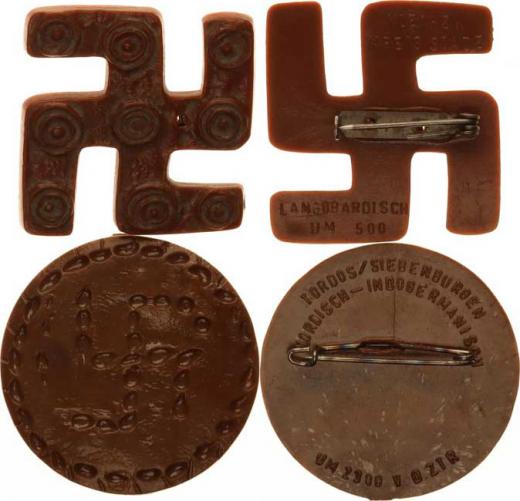 Odznak: Winterhilfe Kriegs, symbol svastiky UM 2300 Ros. 0.345 štít se svastikou hnědá hmota 34 mm orig.spona 2/ Odznak:Winterhilfe Kriegs, symbol svastiky UM 500 Ros. 0.349 svastika hnědá hmota 30x30 mm orig. spona 2 ks