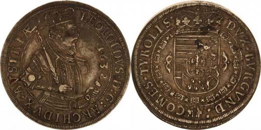Tolar 1632, Tyroly Hall Voglhub. 183/IV opis: LEOPOLDVS. D:G:ARCHIDVX.AVSTRIAE. / DVX.BVRGVND: COMES.TYROLIS. 28,148 g, pěkná patina