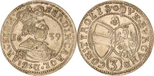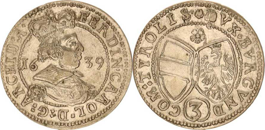 Ferdinand Karel - arcivévoda (1632-1662), 3 kr. 1639 Tyroly Hall