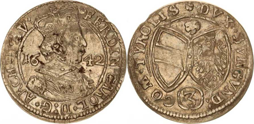 Ferdinand Karel - arcivévoda (1632-1662), 3 kr. 1642, Tyroly Hall