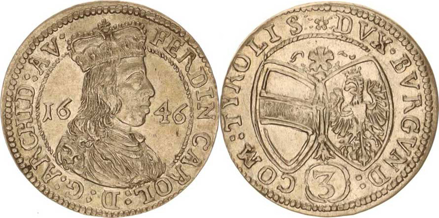 Ferdinand Karel - arcivévoda (1632-1662), 3 kr. 1646 Tyroly, Hall var.: rozdělovací znaménka dvojte