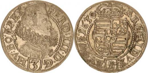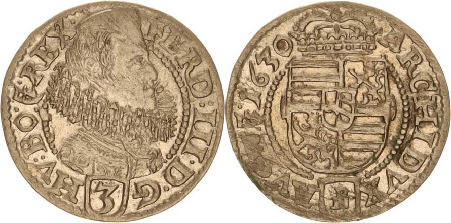 3 kr. 1630 PH, Kladsko-Hema MKČ -, minc. zn. i nominál ve štítu , opis: FERD: III. D.G()HV:BO:Ec:REX. - velká hlava panovníka , dr. vada stř.