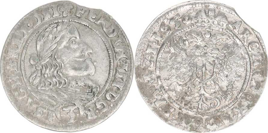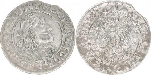3 kr. 1656 b.zn., Vratislav-Hübner MKČ 1295 var.: nad hlavou pětilistá růže, opis: FERDIN.III.D:G.R(3)I.S.A.G.H.B.REX.D.SI nepublikovaný typ, kraj. stř.