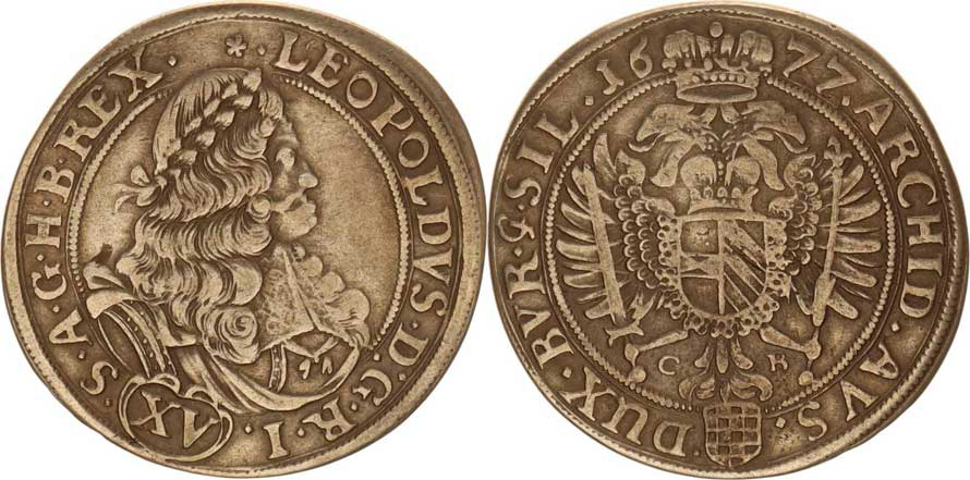 Leopold I. (1657-1705), XV kr. 1677 CB, Břeh-Brettschneider Hol.77.1,1 "RR", tém.