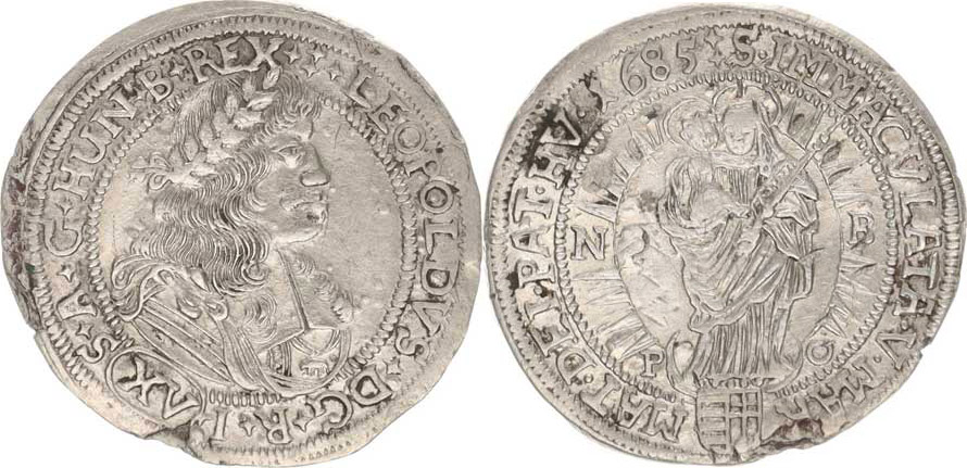 Leopold I. (1657-1705), XV kr. 1685 NB-PO Hol. 85.1.2 "R", vada stř. při kraji