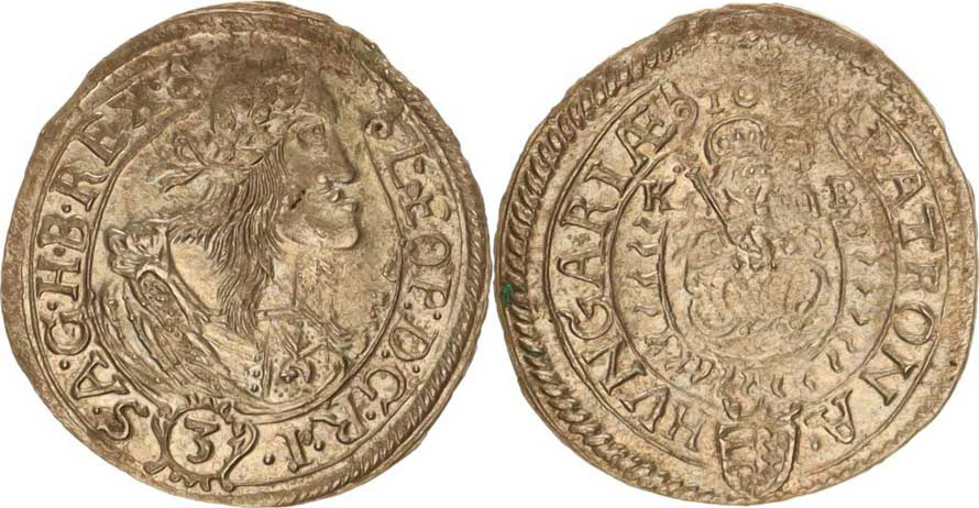 3 kr. 1662 KB Hal.388 var.: před a za dataci tečka, nad ní k řížek, tečka za REX., část. nedor. datace, jinak