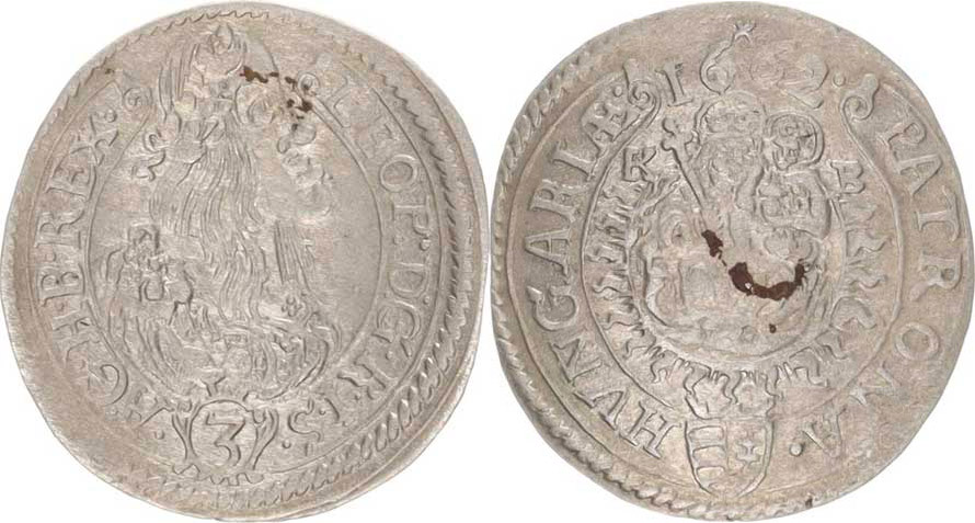 Leopold I. (1657-1705), 3 kr. 1662 KB Hal. 388; Husz. 1464 var.: LEOP:D:G.R.I.S.()