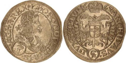 3 kr. 1665 CA, Vídeň-Cetto var.: velká "3" +chyboražba v Rev.: B.CO.TVR. (V místo Y !) "R"