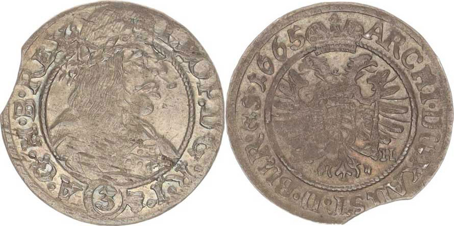 3 kr. 1665 SH, Vratislav-Hammerschmidt MKČ 1618 var. zn. S H pod peřím orlice, kraj. stř., mír. nedor.