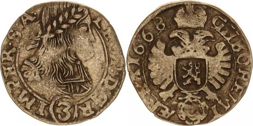 3 kr. 1668, K.Hora-Hackl, jako MKČ 1452 ale minc. zn. v kroužku , tém.