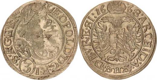 3 kr. 1668 SHS, Vratislav-Hammerschmidt MKČ 1619 var. poprsí, op is: D..BVR.E.SI: 16 . 68.