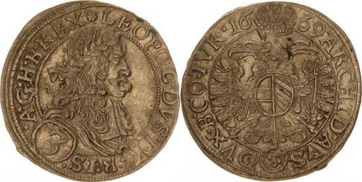 3 kr. 1669 Vídeň-Faber var: .DVX.B.CO.TVR (písmeno V místo Y !) , hlava přerušuje perlovec, velká číslice "3", nad hlavou květink a