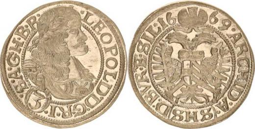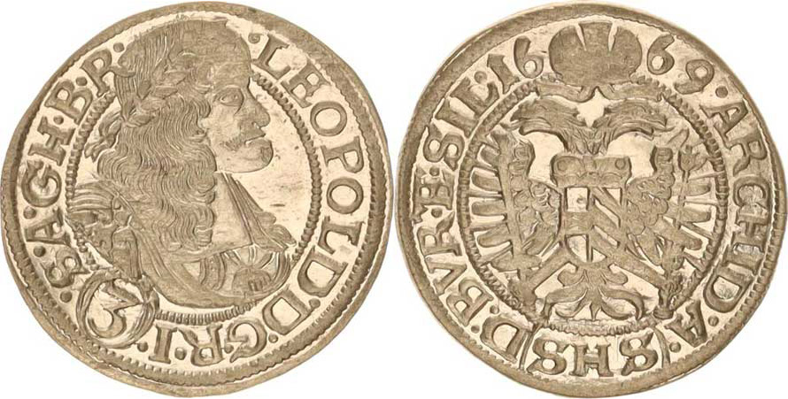 3 kr. 1669 SHS, Vratislav-Hammerschmidt MKČ 1621 var., opis: . LEOPOLD. D.G.R.I. () .S.A.G.H.B.R. / .A. () D: BVR. E. SIL "luxusní stav !"