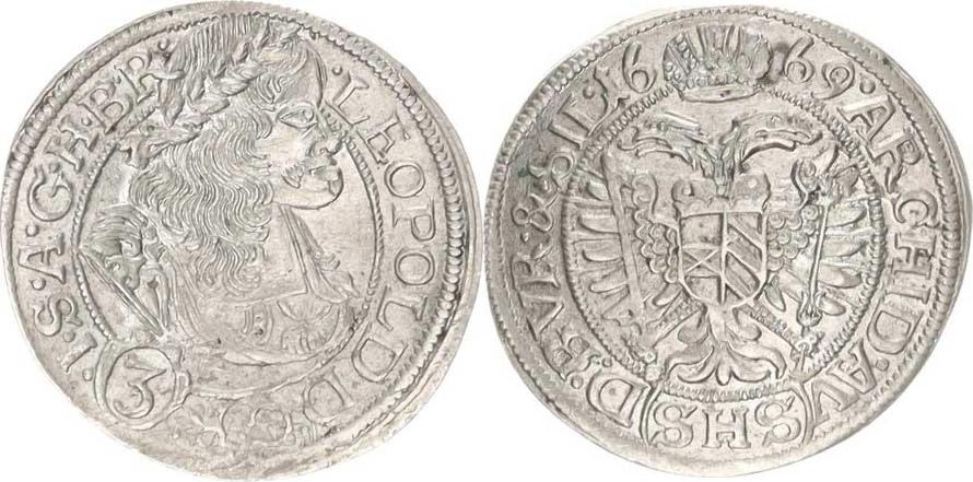 3 kr. 1669 SHS, Vratislav-Hammerschmidt MKČ 1624 var.opisu: .LEO POLD.D.G.R. ( ) .I.S.A.G.H.B.R. / .ARCHID.AV()D:BVR.&.SIL.