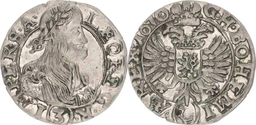3 kr. 1670, K.Hora-Hackl MKČ jako 1453, opis: LEOP. D.G.R. () / hlavy bez jazyků, jiná kresba