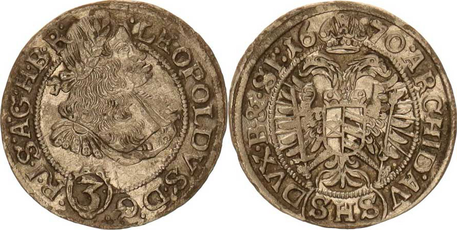 3 kr. 1670 SHS, Vratislav-Hammerschmidt MKČ -, jako 1624 opis: D.G. () .R.I.S.A.G.H.B.R. - ARCHID.AV () DVX. B. &. SI: