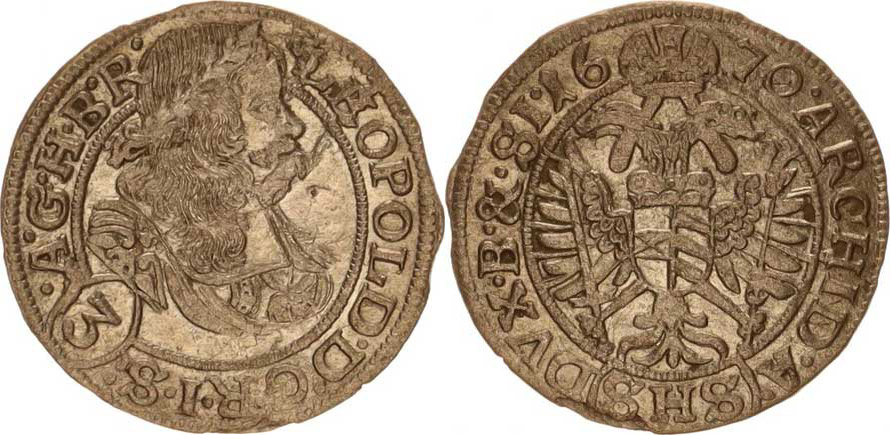 3 kr. 1670 SHS, Vratislav-Hammerschmidt jako MKČ 1622, ale malé poprsí var.opisu: .LEOPOLD.D.G.R.I.S. (3) .A.G.H.B.R. / .ARCHID. A. /SHS/ DVX.B.&.SI. - ve znaku mezi břevny křížek, v horním poli tečka
