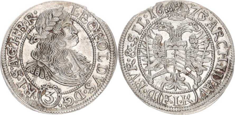 3 kr. 1673 FIK, Opolí-Kirschenhofer var.: tečky mezi písmeny ve značce (F. I. K) / . R.I.S.A.G.H.B.R ., hr.