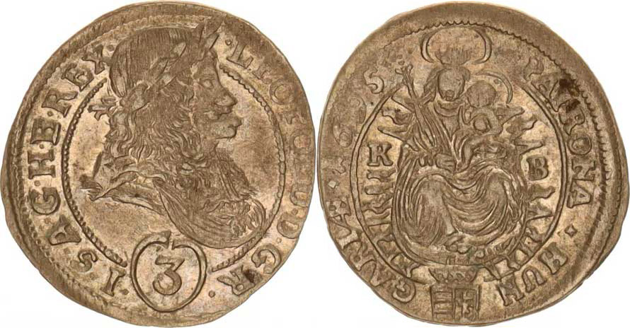 3 kr. 1695 KB Husz. -, malé poprsí a markantně velká "3", opis: .LEOPOLD.D.G.R.() .I.S.A...... / .PATRONA. HUN - GARIAE. (písmeno "U" v HUN), mělčí ražba, tém.