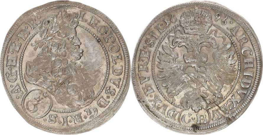 3 kr. 1696 CB, Břeh-Brettschneider MKČ 1700 var. opisu: R.I.S. () / ARCHIDVX.AV () "R", tém.