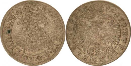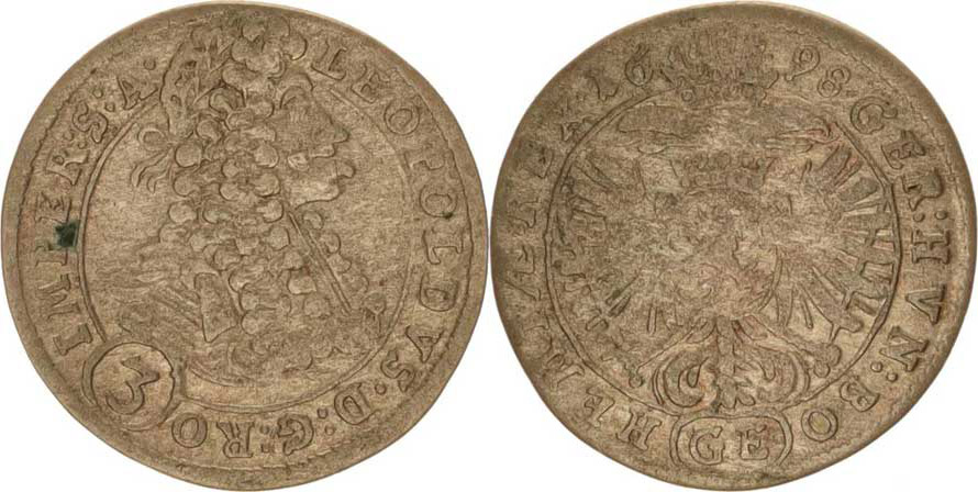 3 kr. 1698 GE, Praha-Egerer MKČ 1425 var.: minc. zn. v oválu, hlavy se dotýkají koruny, velký prsní štítek, v opisu tečka za RE X. / D:G:RO ()