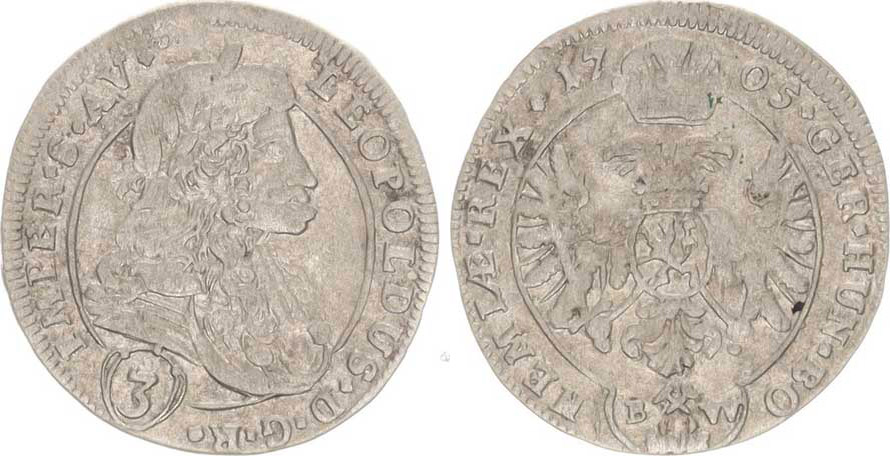 3 kr. 1705 BW, K.Hora-Wohnsiedler jako MKČ 1460, opis: IMPER. S.AV.