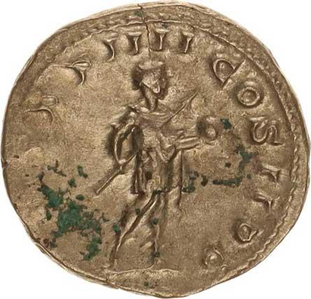 Gordianus III. (238-244), Antoninián, kráč. císař zprava ve vojenském oděvu nese oštěp a gl