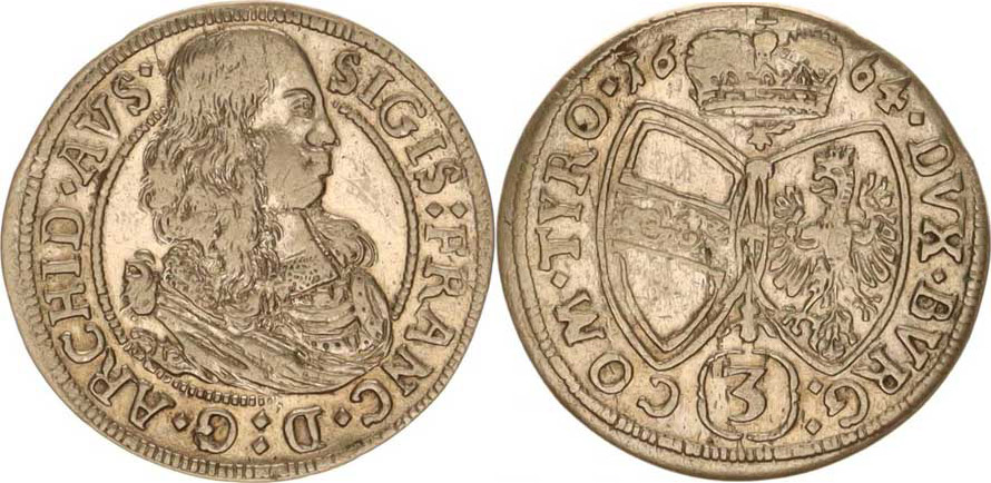 Sigmund František - arcivévoda (1662-1665), 3 kr. 1664, Tyroly, Hall