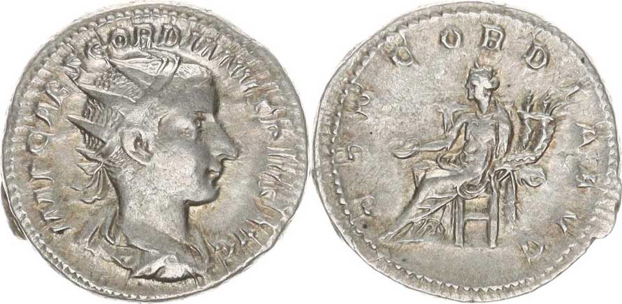 Gordianus III. (238-244), Antoninián, sedící Concordia zleva drží obět.misku a dvojitý