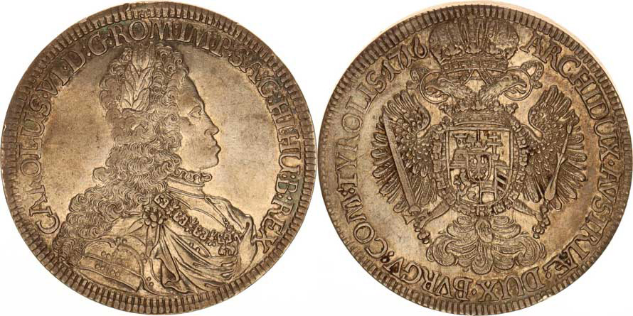 Karel VI. (1711-1740), Tolar 1716 b.zn., Tyroly-Hall Voglh. 259/2 var. bez tečky z