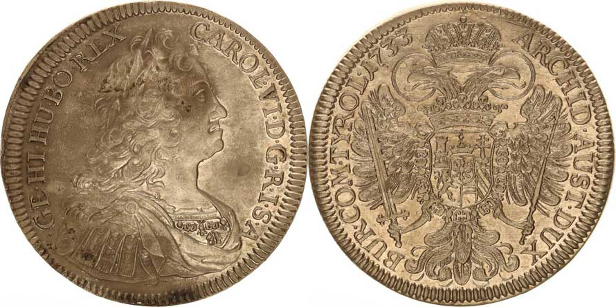 Tolar 1733 b.zn., Tyroly Hall - var.: pod poprsím dvě tečky 28, 377 g