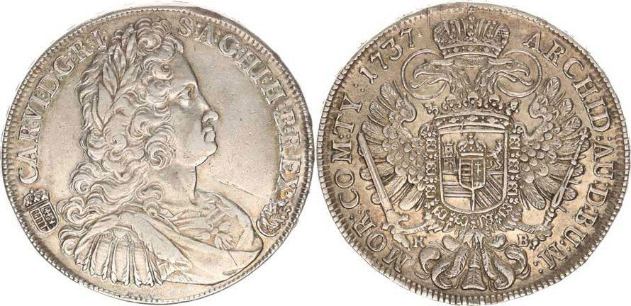 Karel VI. (1711-1740), Tolar 1736 KB, Kremnica Hus. 1606 var.: tečka za datací