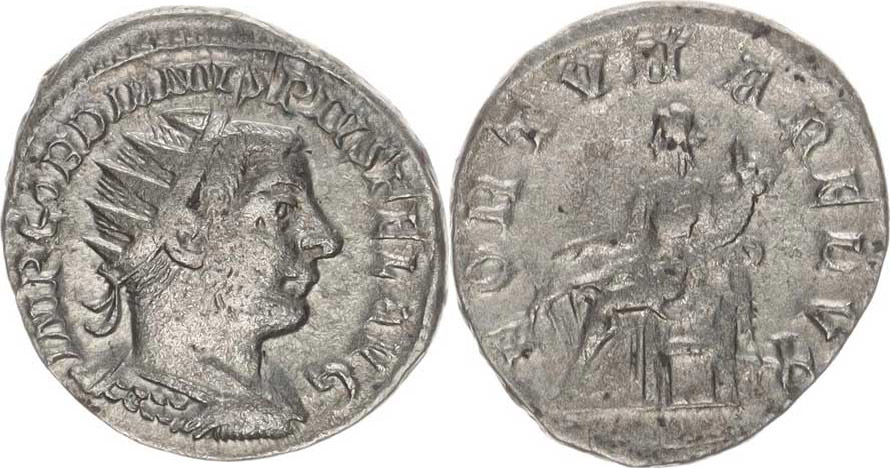 Gordianus III. (238-244), Antoninián, sedící Fortuna zleva s kormidlem a rohem hojnosti